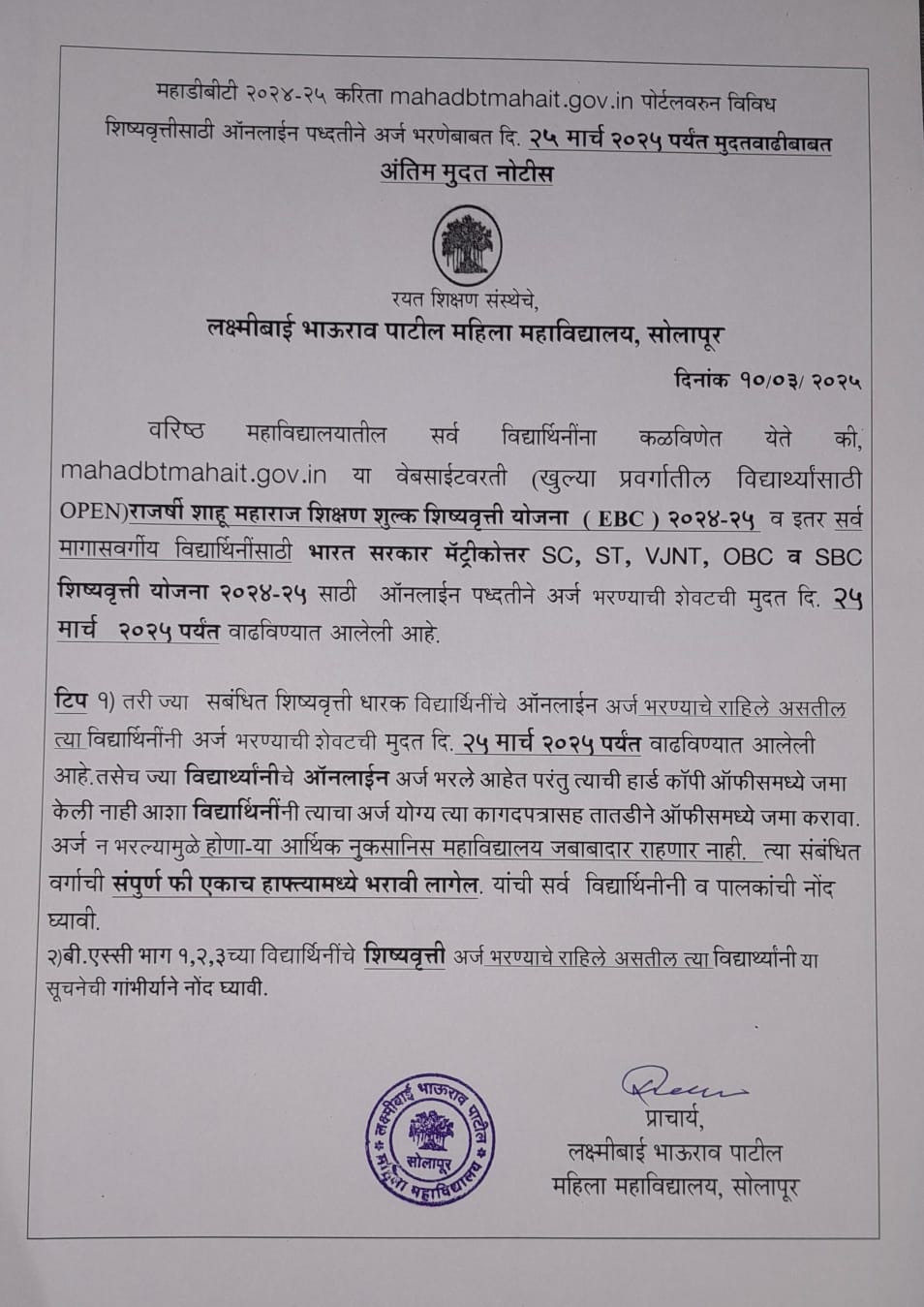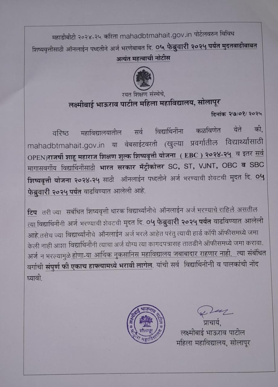 Laxmibai Bhaurao Patil Mahila Mahavidyalaya is an institute committed to the empowerment of girl students. It is my privilege to warmly welcome you to the portal of our college; Laxmibai Bhaurao Patil Mahila Mahavidyalaya which is an institute having a commitment towards empowerment of girl students.