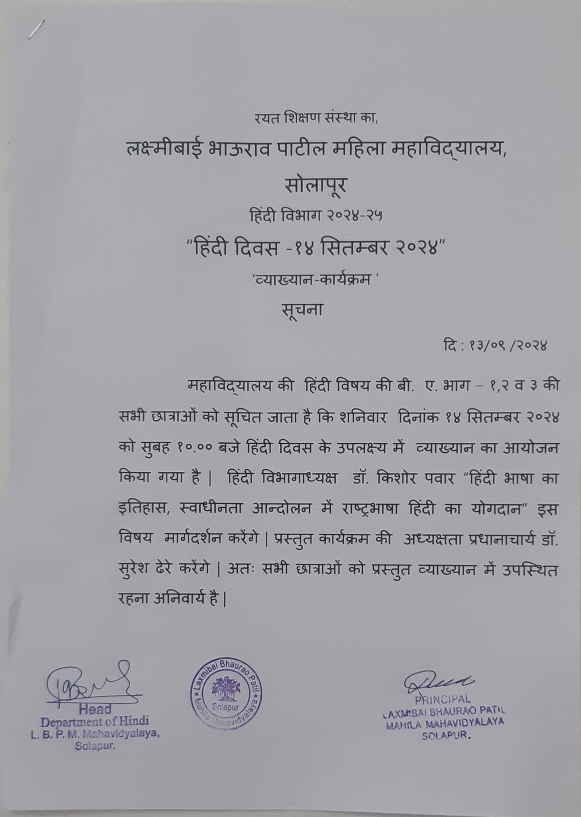 Notice : Hindi Day -2024-25