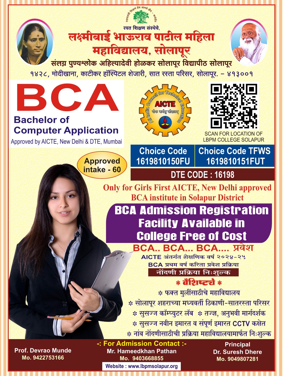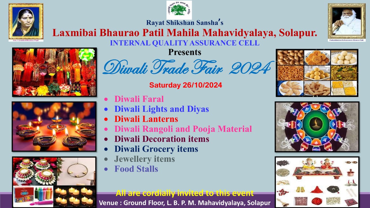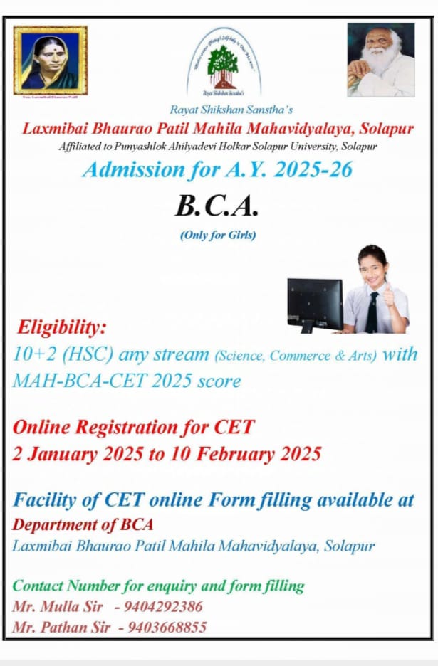 Laxmibai Bhaurao Patil Mahila Mahavidylaya, Solapur is affiliated to Solapur University, Solapur (Maharashtra). It is governed by Rayat Shikshan Sanstha, Satara, prominent educational institutions in Maharashtra established by late Padmabhushan Dr. Karmveer Bhaurao Patil. The motto of sanstha is "Education Through Self-Help". Dr. Karmveer Bhaurao Patil "Earn and Learn" Scheme for the needy students. The College is established in June 1989 & today it is one of the leading colleges in Solapur University, Solapur. University Grants Commission, New Delhi, has recognized the said college u/s 2(F) the UGC act 1956 wide letter No. F.No. 8-409/2006/(Cpp-I/C) date 12/03/2013 & also u/s 12(B) of the UGC act 1956 wide letter No. F.No. 8-409/2006(CPP-I/C) dated 19/07/2013 respectively. We are catering higher education to girl students with the motto "Women Empowerment" Through Quality Education".