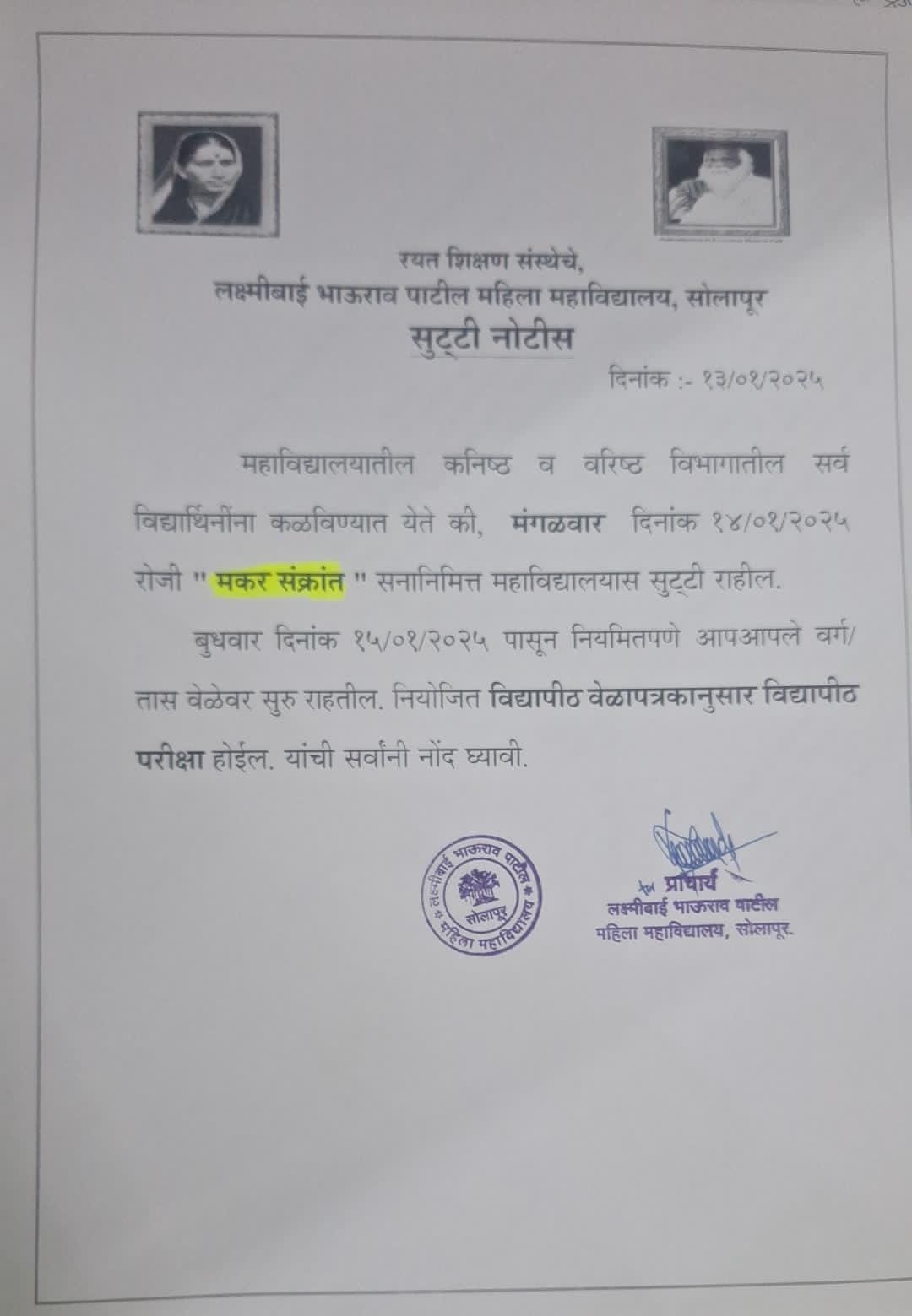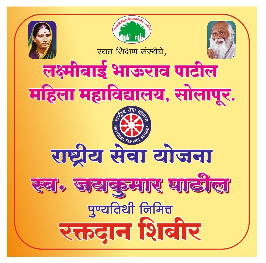Laxmibai Bhaurao Patil Mahila Mahavidylaya, Solapur is affiliated to Solapur University, Solapur (Maharashtra). It is governed by Rayat Shikshan Sanstha, Satara, prominent educational institutions in Maharashtra established by late Padmabhushan Dr. Karmveer Bhaurao Patil. The motto of sanstha is "Education Through Self-Help". Dr. Karmveer Bhaurao Patil "Earn and Learn" Scheme for the needy students. The College is established in June 1989 & today it is one of the leading colleges in Solapur University, Solapur. University Grants Commission, New Delhi, has recognized the said college u/s 2(F) the UGC act 1956 wide letter No. F.No. 8-409/2006/(Cpp-I/C) date 12/03/2013 & also u/s 12(B) of the UGC act 1956 wide letter No. F.No. 8-409/2006(CPP-I/C) dated 19/07/2013 respectively. We are catering higher education to girl students with the motto "Women Empowerment" Through Quality Education".