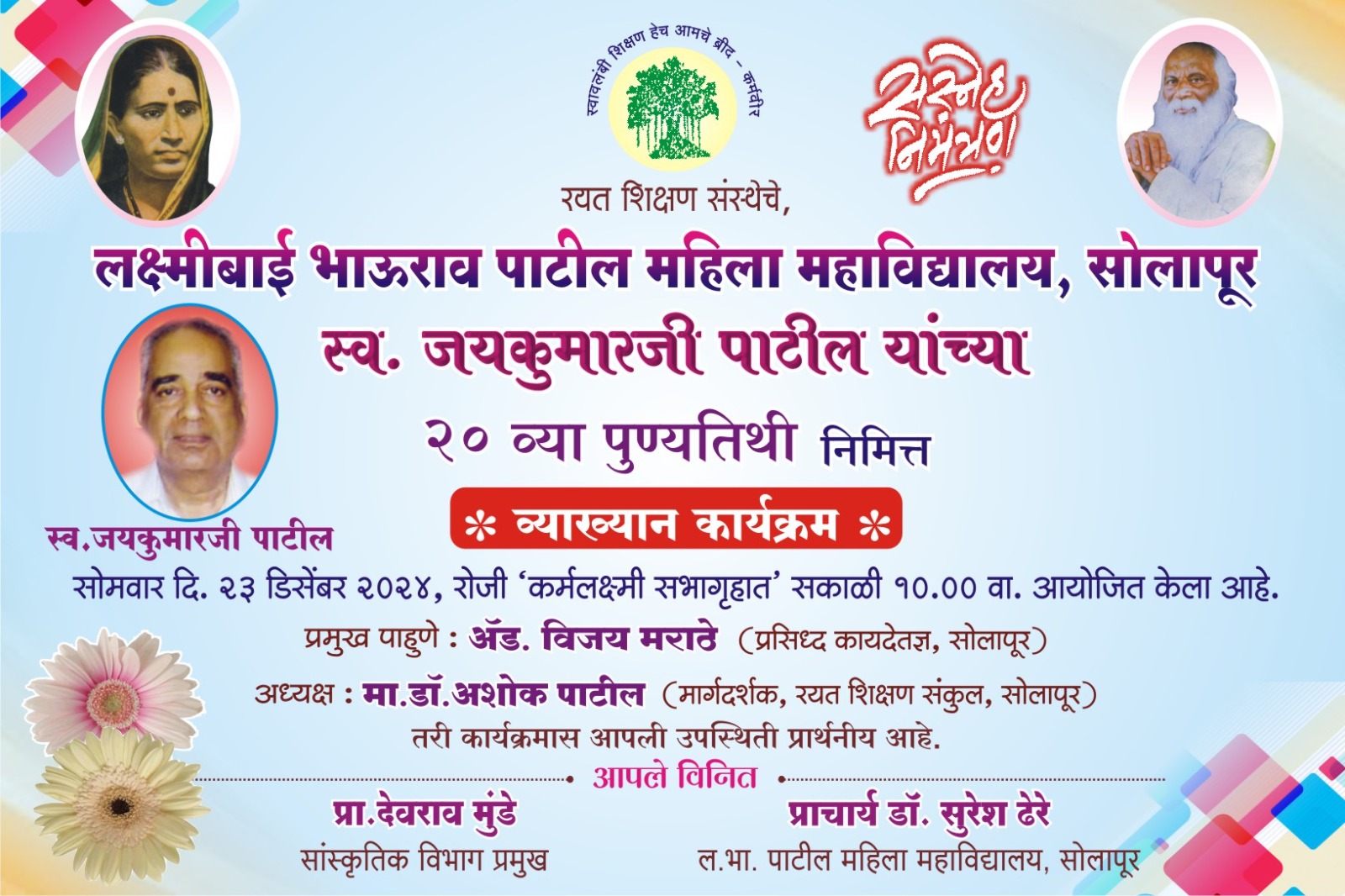 • सौ.लक्ष्मीबाई भाऊराव पाटील यांचा पुण्यस्मरण कार्यक्रम.