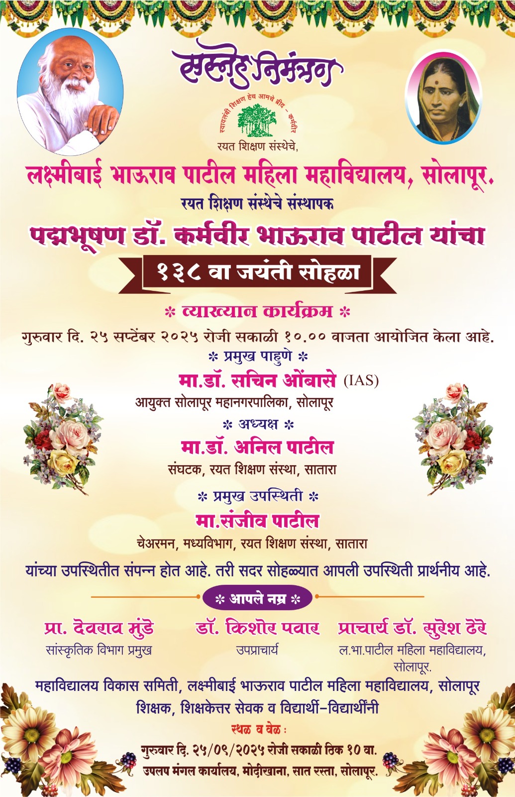 निमंत्रण पत्रिका: कर्मवीर भाऊराव पाटील 138 वा जयंती सोहळा- 2025