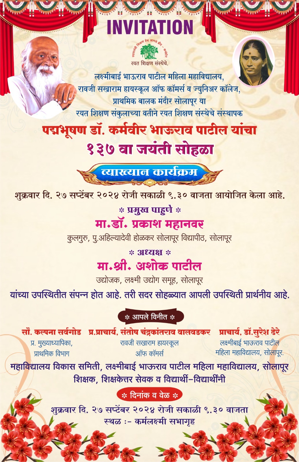 पद्मभूषण डॉ.कर्मवीर भाऊराव पाटील यांचा १३७ वा जयंती सोहळा कार्यक्रम- २०२४